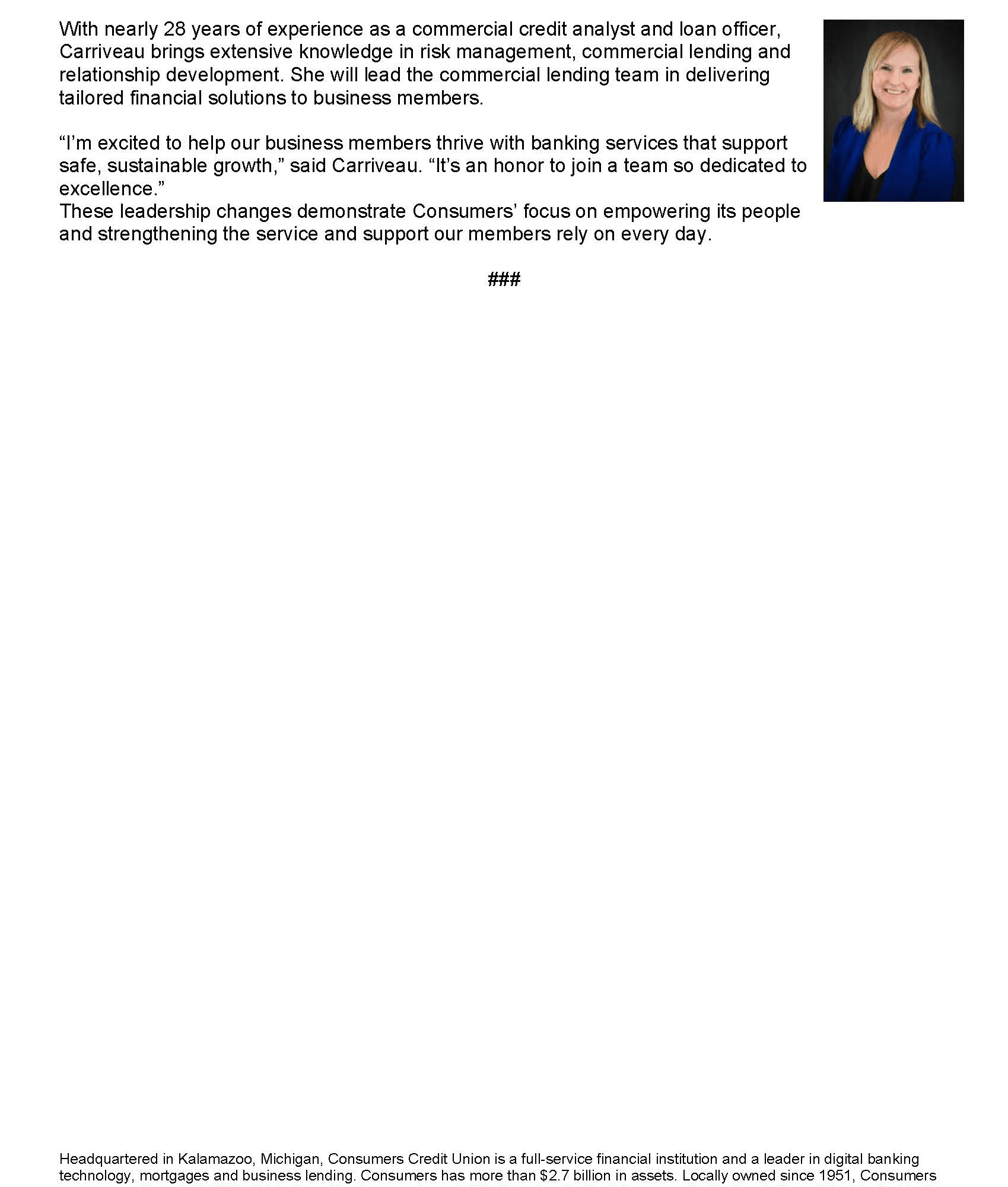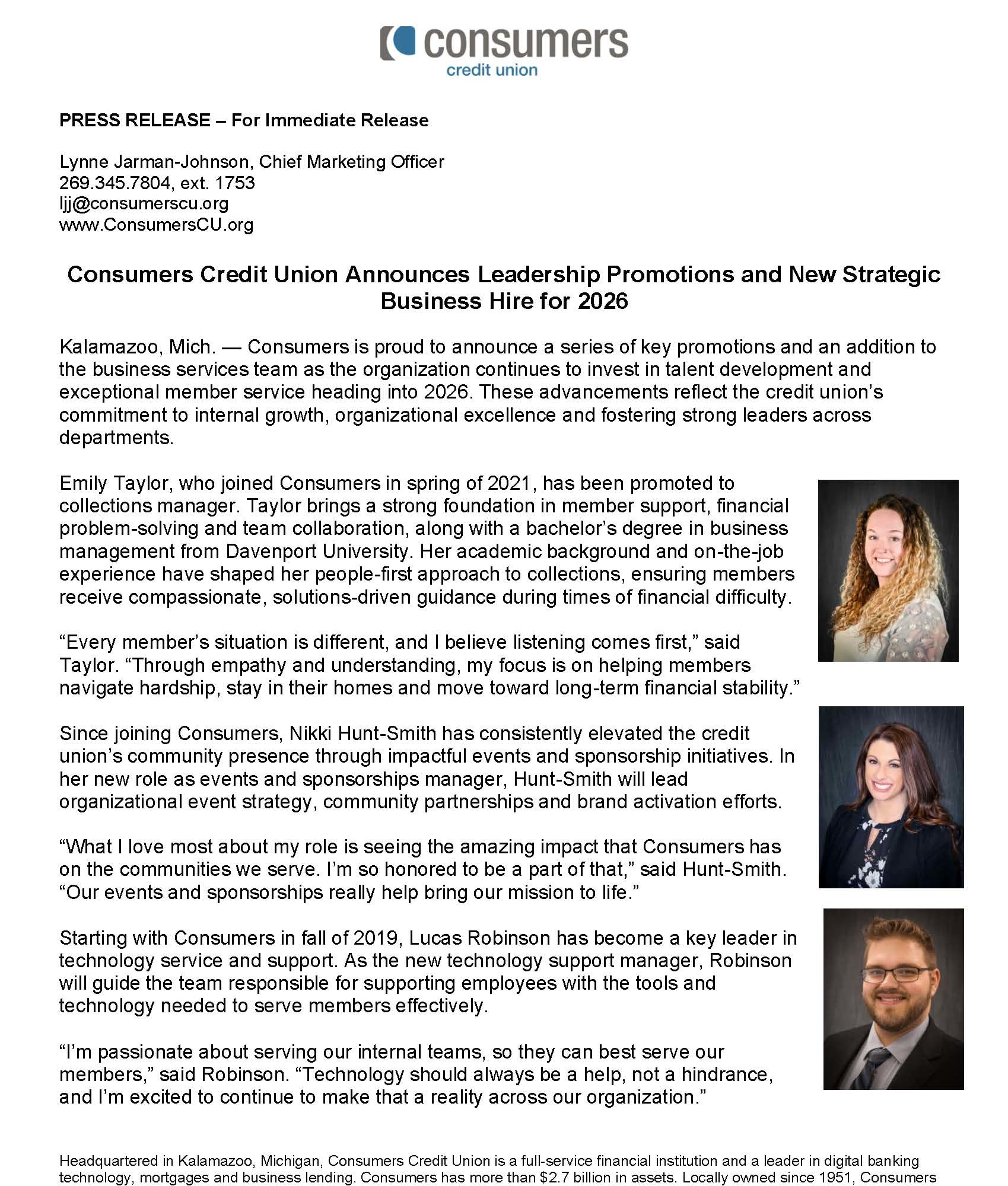 Consumers Credit Union Announces Leadership Promotions and New Strategic Business Hire for 2026
