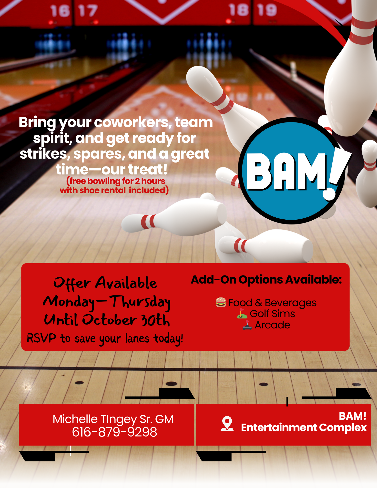 Come on in and check out the changes to BAM! Entertainment Center under new ownership (Lucky Strike Entertainment). We are offering local businesses a free bowling event for 2 hours including shoe rental. Add on options available for food, beverages and additional activities. Available Monday-Thursday until October 30th. RSVP today with Senior GM Michelle Tingey at 616-879-9298.