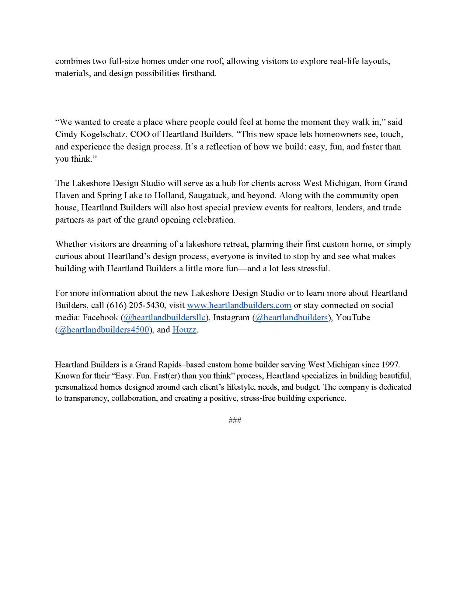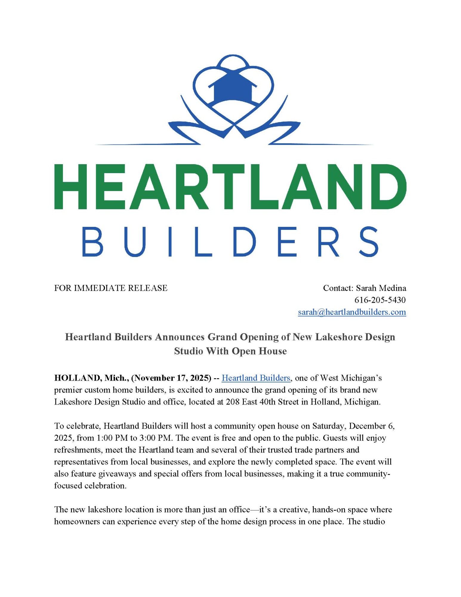 Heartland Builders Announces Grand Opening of New Lakeshore Design Studio With Open House