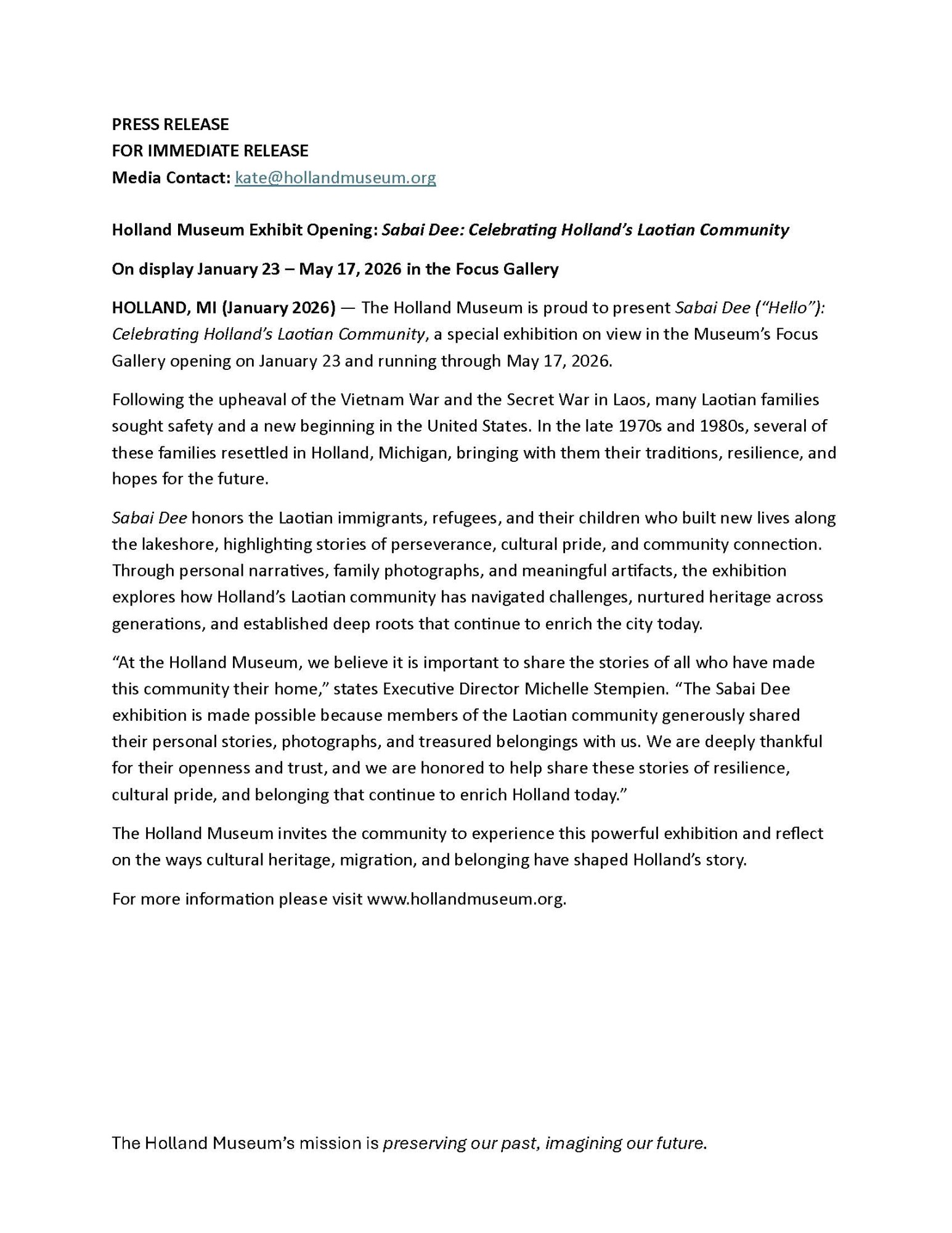 Holland Museum Exhibit Opening: Sabai Dee: Celebrating Holland’s Laotian Community