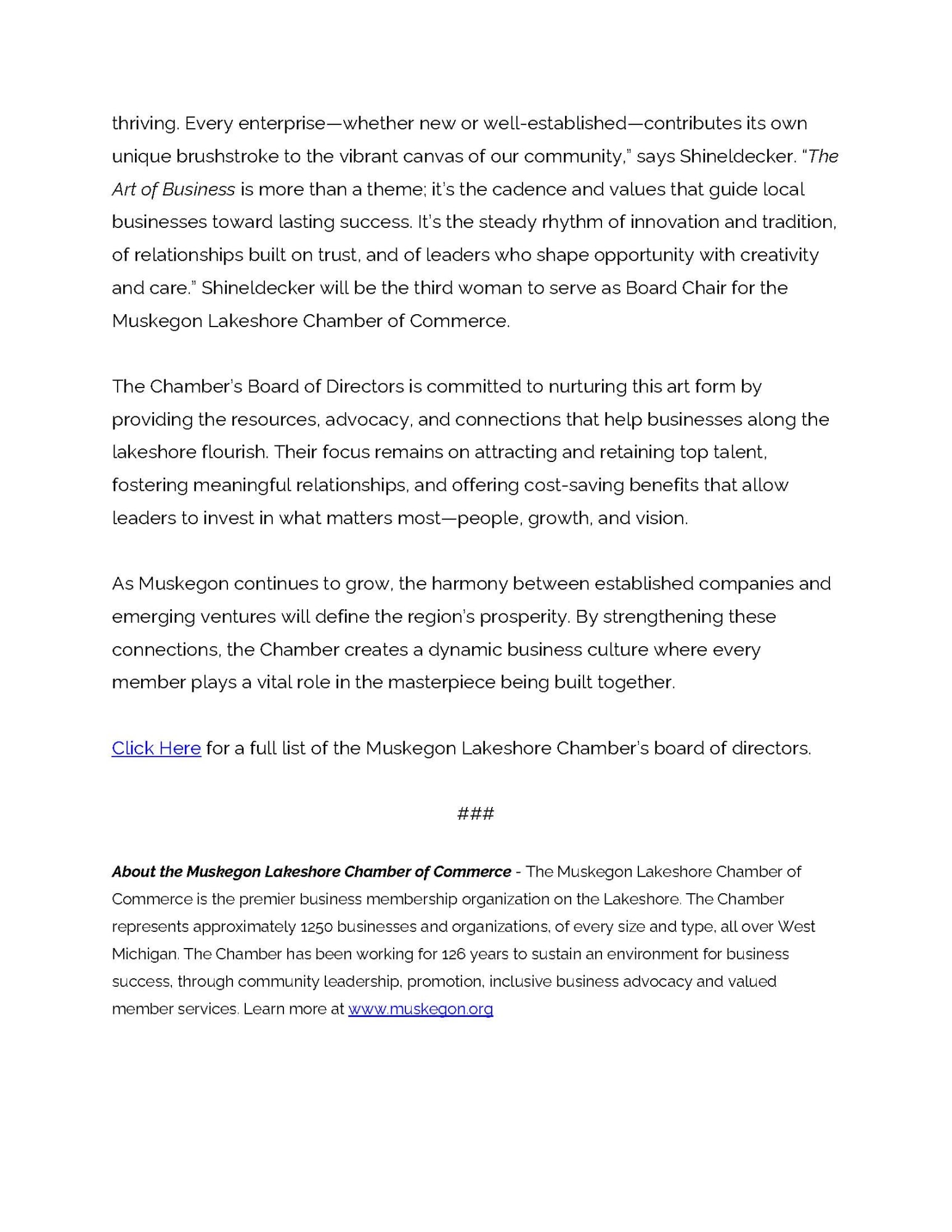 Muskegon Lakeshore Chamber of Commerce Announces Board of Directors and Theme for 2026
