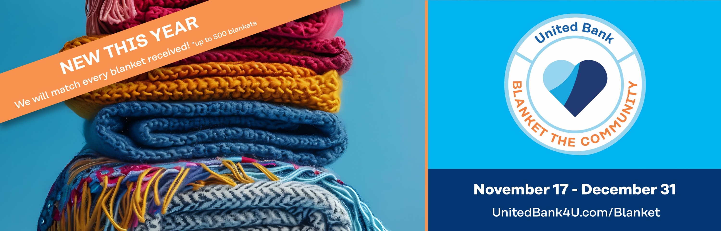 Warm hearts make a real difference to those who struggle to stay warm during cold winter months. That’s why United Bank is continuing its annual Blanket the Community Project, collecting blankets at all branch locations, and distributing them to our neighbors in need. When you deliver blankets to our United Bank branch in Holland, your blankets will be donated to Hope Pkgs.